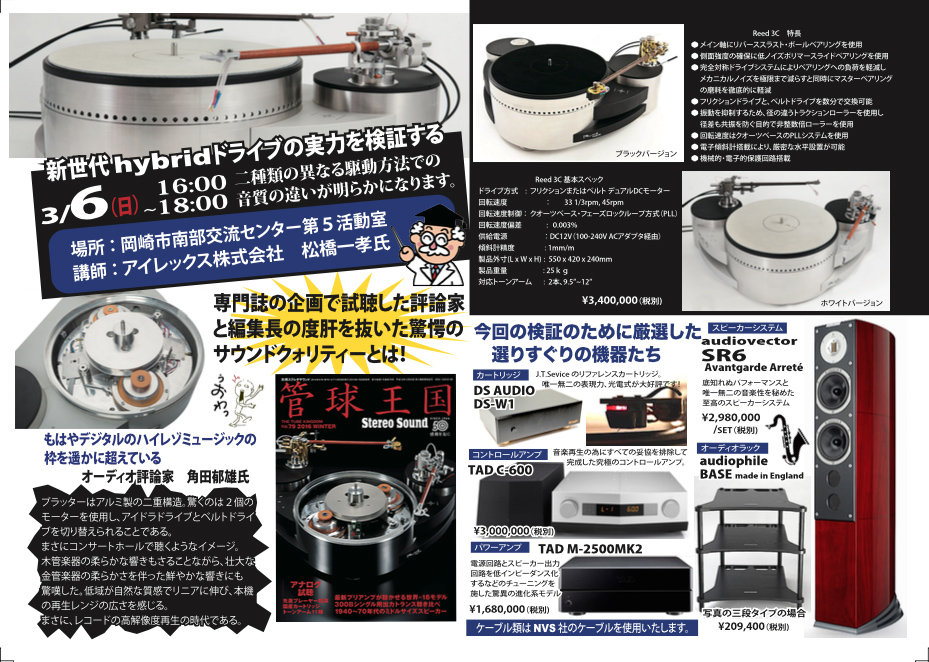 当日はReed社の製品作りに対する哲学や、Muse 3Cの音質並びにアイドラ/ベルトドライブの切替え実演等を行う予定です。