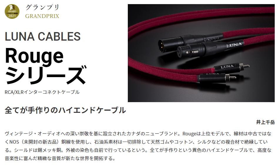 Luna CablesのRougeシリーズがオーディオアクセサリー銘機賞2021にてグランプリを獲得しました。