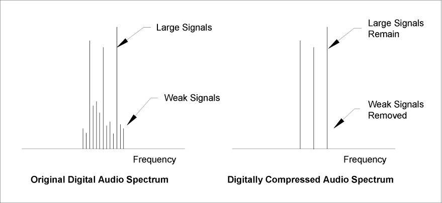 最も代表的なデジタル圧縮は、周波数ドメインで信号の強さを見ながら、強い信号を残し弱い信号を捨て去る方法です。図1の左はオリジナルのスペクトルの一部で、強い信号と弱い信号が混在しています。このように強い信号の近傍に弱い信号が存在する場合、弱い信号は強い信号にマスクされて聞こえにくくなります。どうせ聞こえないのであれば捨ててしまおうと言うのがデジタル圧縮です。その様な判断から弱い信号を全て捨ててしまったのが右の図です。明らかに情報量が減ってデジタル圧縮の目的は達成しています。しかしこの様にして捨てられた微弱な信号の多くは高調波です。高調波は音の特徴を伝える重要な役割を持っています。このように高調波情報が捨てられてしまうと音質の劣化は免れません。特にディーテールやニュアンスが失われ、つまらない音になってしまいます。