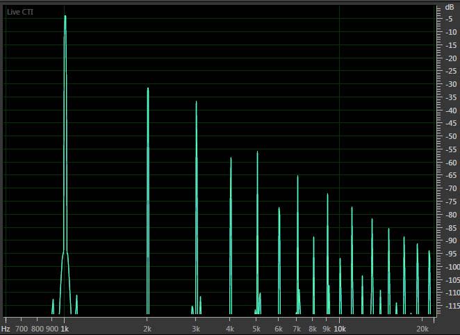 図2はEilex Harmonyの実際の動作の例で、1KHzの基本波から高調波が作られる様子を示しています。Eilex Harmonyは、基本波から偶数次(2次、4次、…)と奇数次 (3次, 5次、…) 高調波を効率良く作り出します。偶数次好調波は、元の音に加えられると音をスムーズにする傾向があります。一方奇数次高調波は、音をブライトでシャープにします。偶数次と奇数次高調波の比率と量を加減する事により、音質が向上する最適値を見出すことが出来ます。因みに、加えられる高調波のレベルは -30dB以下です。