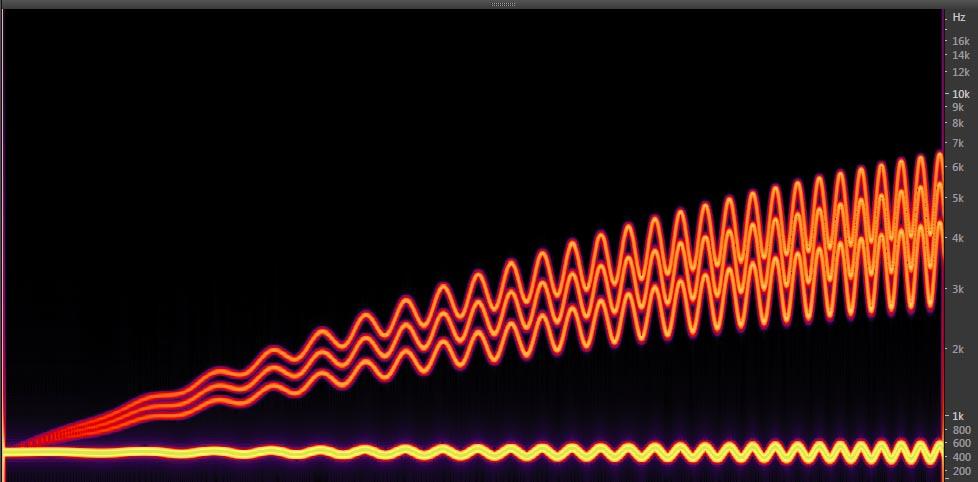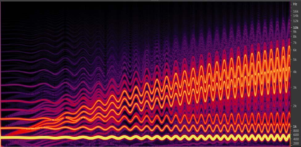 次に Eilex Harmonyの動作を、テストシグナルを使って示します。図3はマルチ・モジュレーション・スイープ テスト信号です。それぞれのスイープ信号はウォブルトーンとも呼ばれます。横軸は時間 (0-10 Sec)、縦軸は周波数 (0-24 KHz) です。