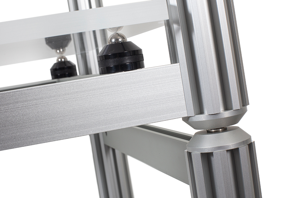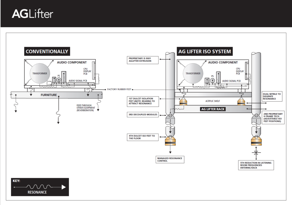 AG Lifterの設計は、オーディオ機器からアクリルラック板を介して不要な共振を排出し、AG Lifter Dulcet 19 アイソレーションフットで減衰させます。その後共振成分はラックフレームへと伝達し、AG Lifter独自の合金押出成形のパーツとラック柱を通して空気中へ放出させます。「ライブフレーム」と呼ばれるこの手法は、ラックが共鳴やエネルギーを蓄積せずに空気中に放出させるところに大きな特徴があります。