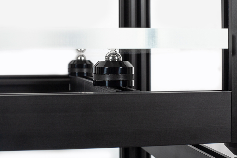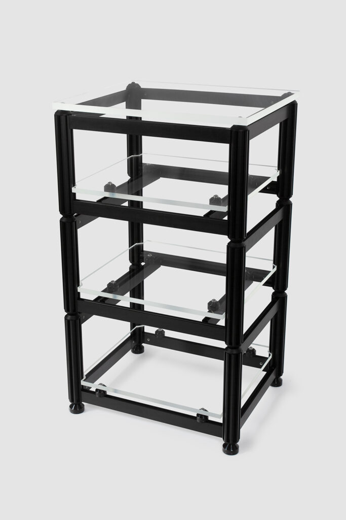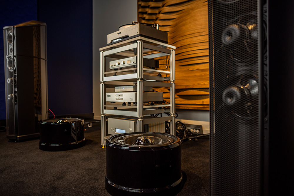 Crescendoアイソレーションラックは、床からDulcet 20(ラージ)アイソレーションインシュレーターを使用した複数層の構造となっており、各ラック段は、垂直のカスタム押出材に圧入されたビレットCNC加工キャップ内のSUSベアリングを使用して分離されます。各アクリル棚は、Dulcet 19(スモール)アイソレーションインシュレーターを使用して機材から発せられる振動を吸収。