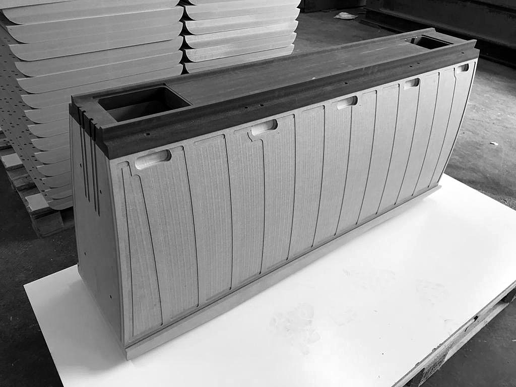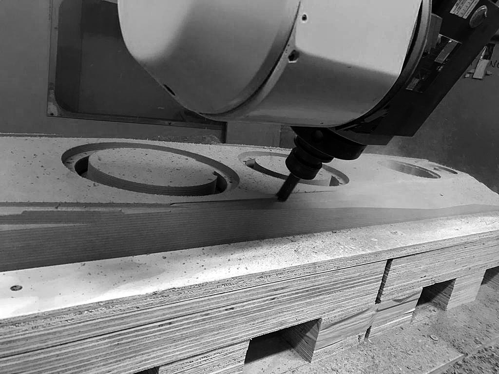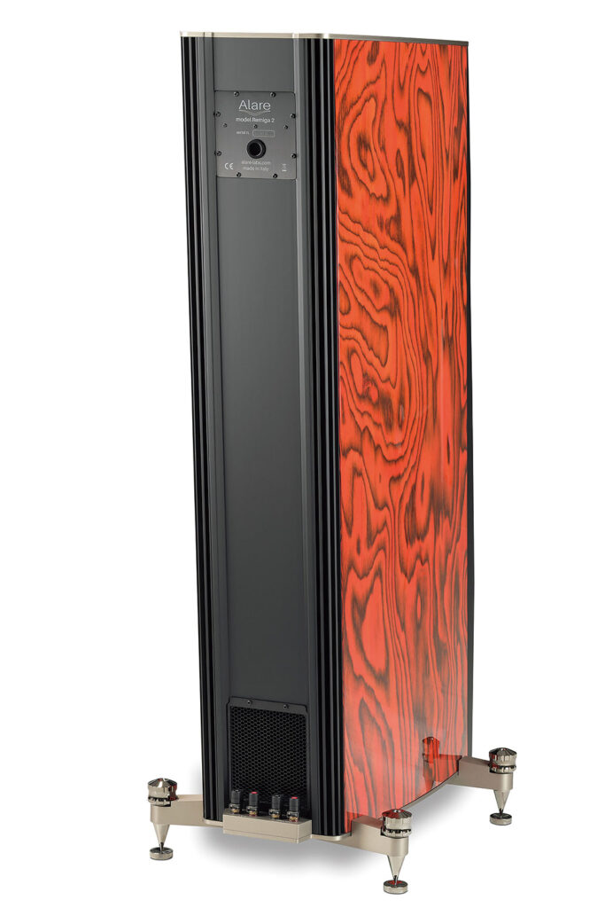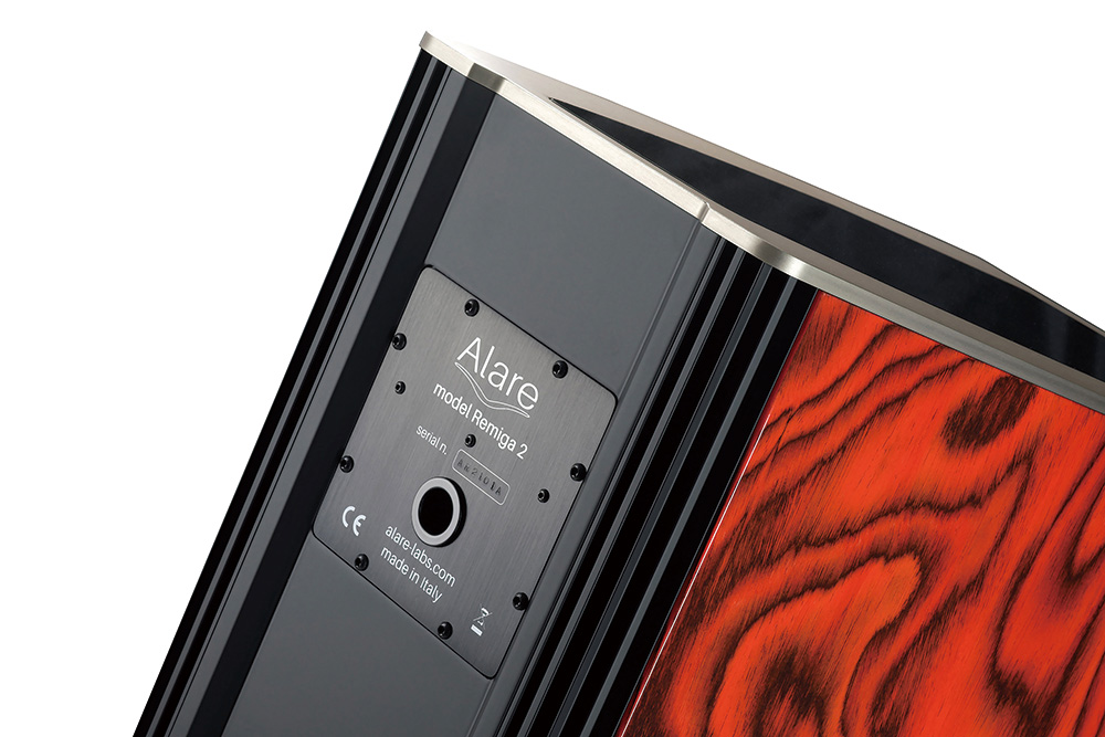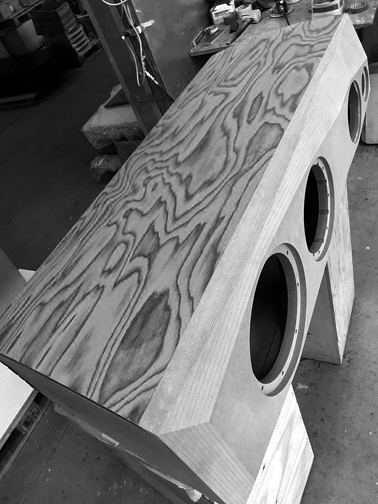 Remiga2のキャビネットは複数の種類の木材が使用されています。振動吸収効果の計算に基づき異種の木材を幾層も重ねる事により、効果的に不要な振動の発生を抑制しています。