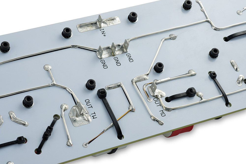 パーツは主にドイツMundorf社製の高性能パーツを使用し、非電導性のボード上に設置。配線は銀メッキ銅単線を使用する事により、電気経路の不要な干渉を排除しています。