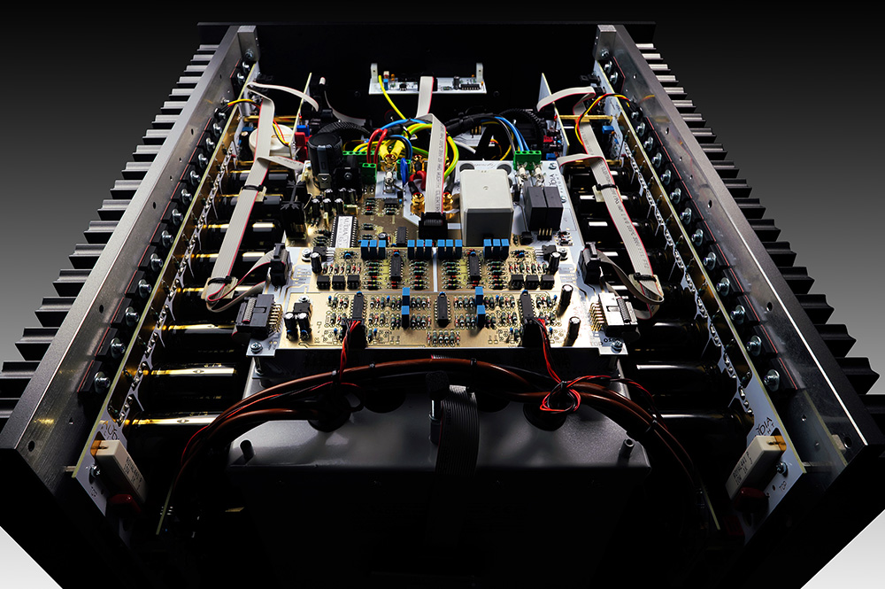 アルミニウムシールドとエポキシ樹脂で封止された独自のゲインステージは、安定性と干渉からの保護を確保します。出力ステージには、エポキシ樹脂で密封されデュアル強磁性シールドに収納された巨大な3000VA・UIコアカスタムオーディオトランスが搭載され、絶対的な精度で強大なパワーを提供します。このトランスは日本市場だけのために100V専用巻きとなっており、一般的なマルチボルテージトランスとは一線を画す音質性能を発揮します。