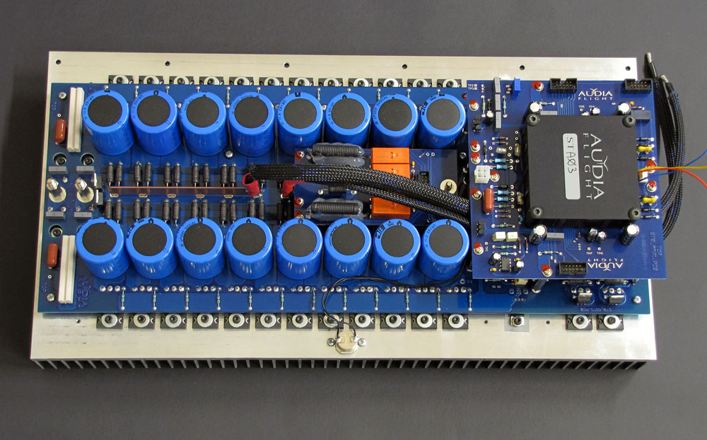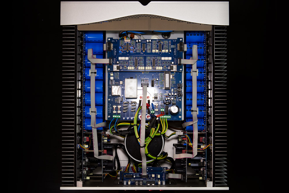 ● ゲインステージはL/Rチャネル完全ディスクリート構成で純A級バイアス動作のAUDIA独自の電流フィードバック回路により0.3Hz~1MHz、スルーレイト200/μs以上という驚異のスペックを実現。また、ゲインステージ基盤はアルミ製エンクロージャーに格納されており、動作時温度を一定に維持。また、内部はエポキシ樹脂が充填されており、エンクロージャ外部では大型アルミプレートを放熱目的で設置