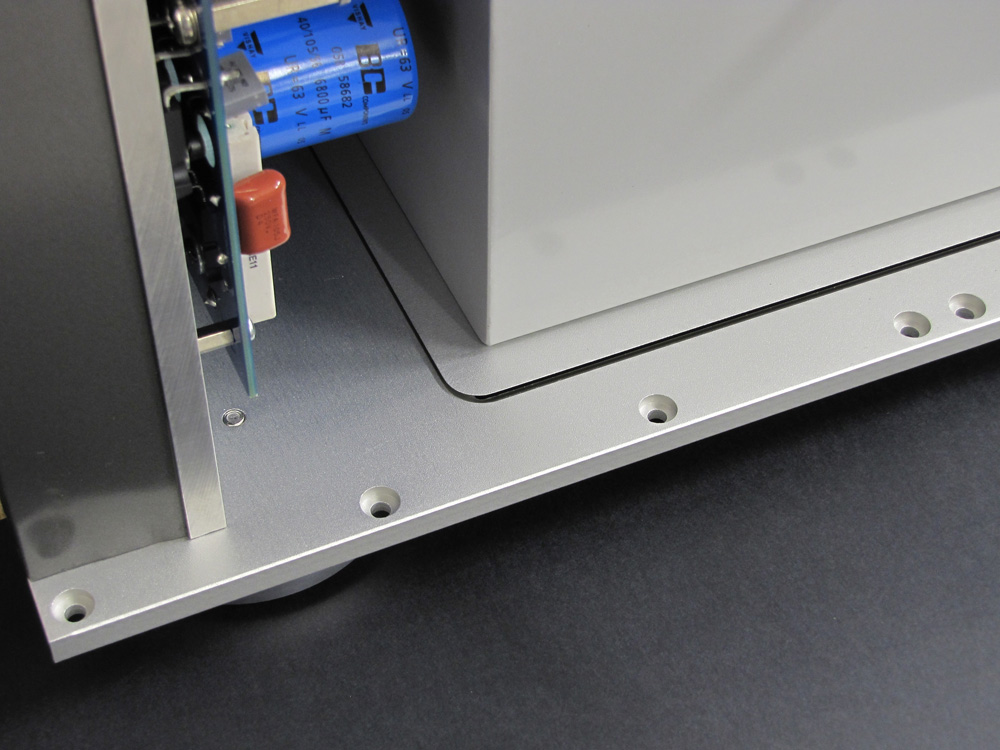 ● 出力段は3000VAの特殊U+Iコアトランスが使用され、エポキシ樹脂が充填された二重の電磁シールドケースに収納。更にこのシールドケースをメイン躯体から独立させ隔離する事によりトランスの振動を完全に遮断。更に2つの150VAトロイダルトランスがメインステージで使用され、15VAトランスをロジックボード用に使用