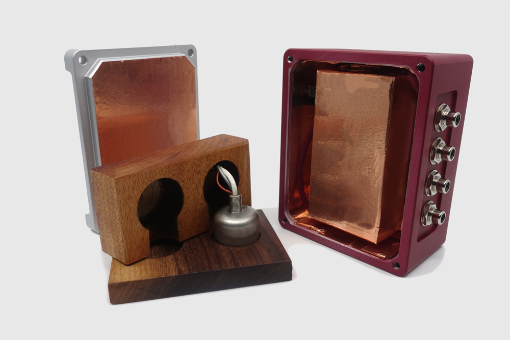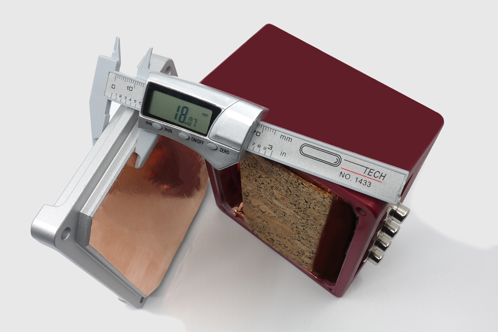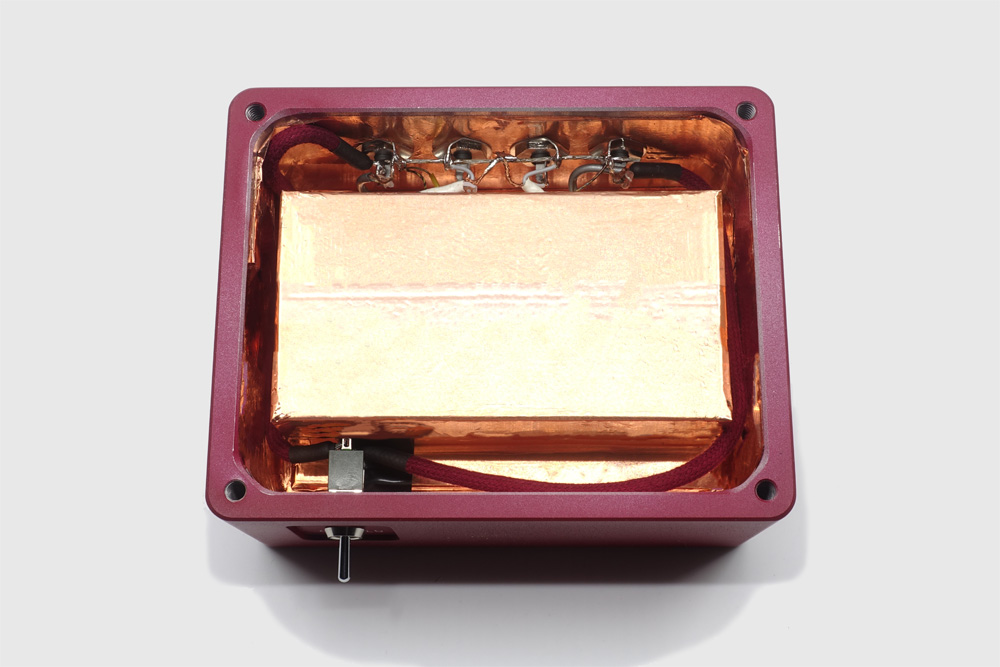 ウォールナットやマホガニーは高級ギターのボディに使用され素晴らしい音の響きを奏でますが、ギタリストでもあるDanny氏がここに着目し、様々な材質での比較試聴を経て最高の響きを奏でる組み合わせに辿り着きました。この木製ケースを銅箔で包み、最大厚18mmにもなるアルミ削り出しのケースに収納。勿論内部配線は全てROUGEシリーズケーブルが使用されており、飛躍的なS/N感がありながら自然で豊かな音色と奥行き感のある音楽を引き出します。